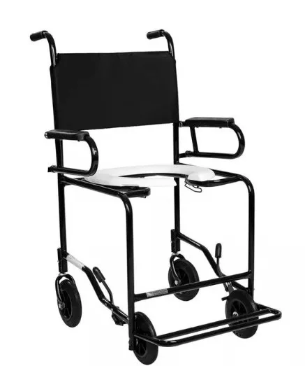 Fabricada em aço carbono, pintura epóxi, assento sanitário removível, encosto em nylon, apoio para os braços escamoteavel apoio para os pés escamoteável, freios bilaterais rodas traseiras aro 06″ giratórias com pneus maciços rodas dianteiras aro 06″ com pneus maciços posicionadas na parte interna da cadeira.