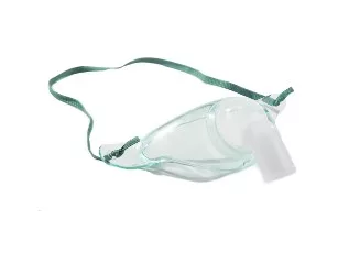 Máscara para nebulização de traqueostomia com conector giratório em polietileno e o conector da máscara em polipropileno e fixador em faixa elástica.